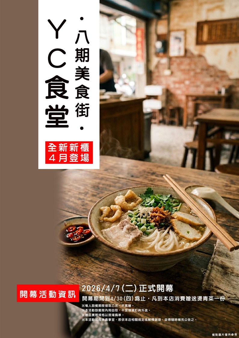 八期「Y.C食堂」2026/4/7(二)正式開幕 開幕期間到4/30(四)為止,凡到本店消費贈送燙青菜一份